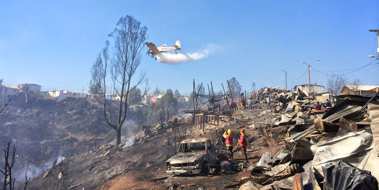 También indica que la mayoría del fuego ha sido controlado y que hay mucha gente que tiene buen ánimo, sin embargo, no se sabe dónde van a quedarse los albergados ya que seguramente las clases van a comenzar próximamente y las escuelas no podrán continuar alojando a la gente.